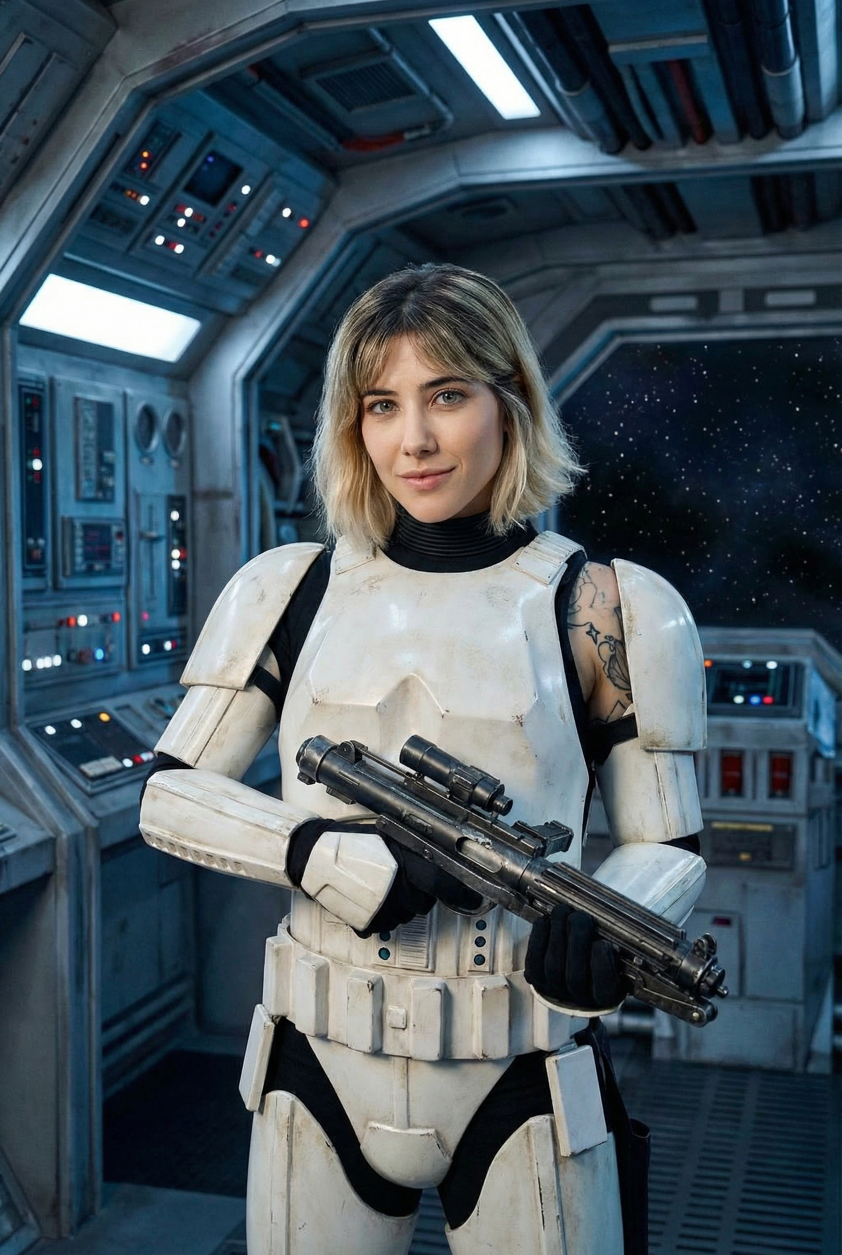 This young caucasian woman wearing a sci-fi storm trooper costume, spaceship in background