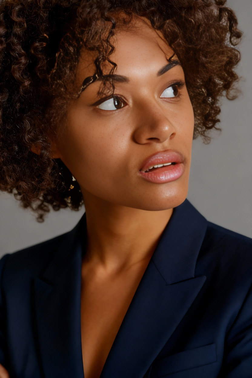 Professional headshot for this woman, confident business executive, navy suit, neutral gray background, soft studio lighting, sharp focus, corporate portrait
