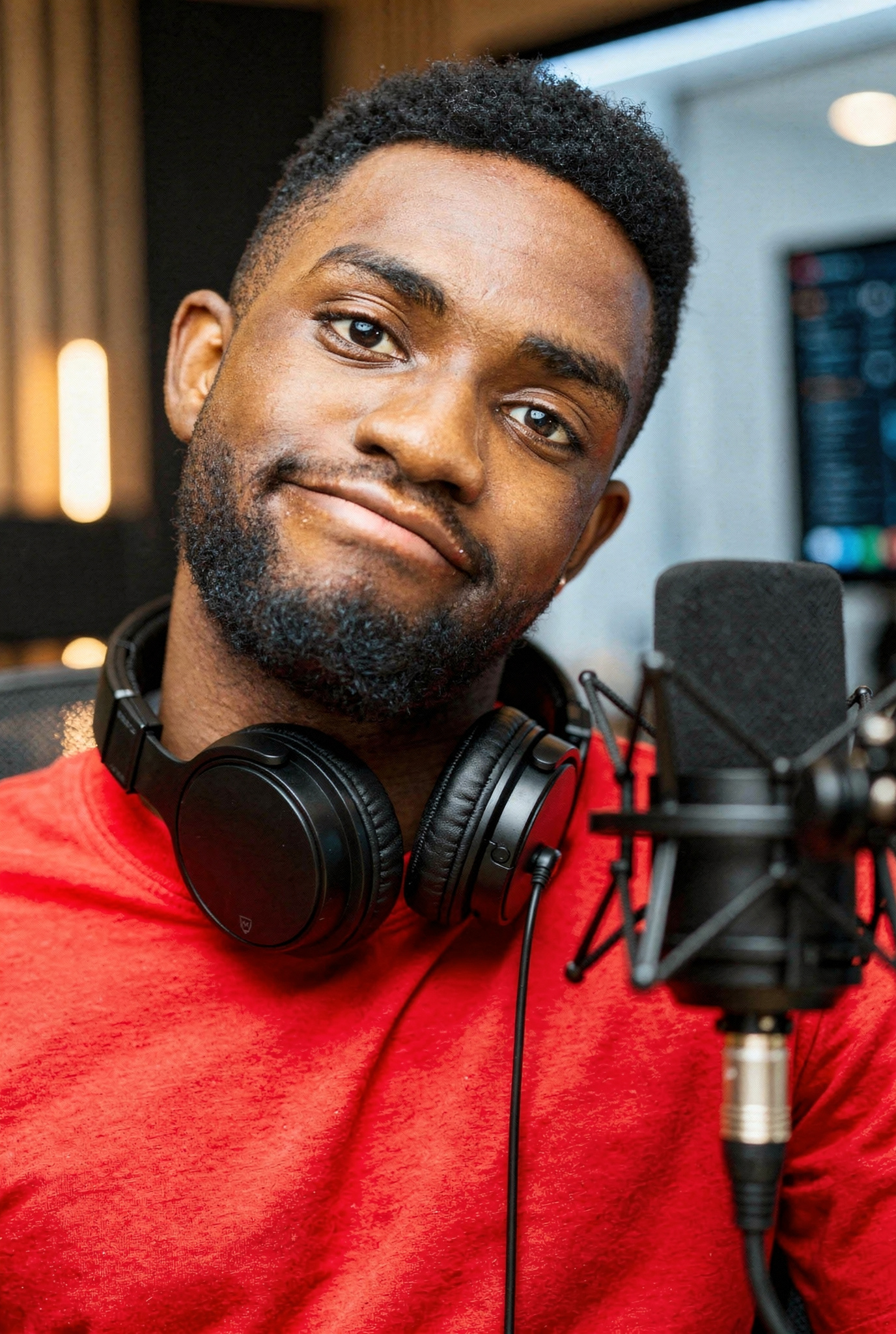 This man is a podcast host in modern studio setup, professional lighting, wearing headphones around neck, warm inviting expression