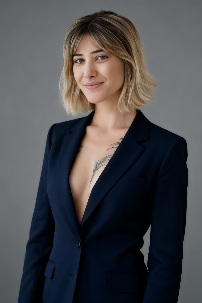 Professional headshot for this woman, confident business executive, navy suit, neutral gray background, soft studio lighting, sharp focus, corporate portrait