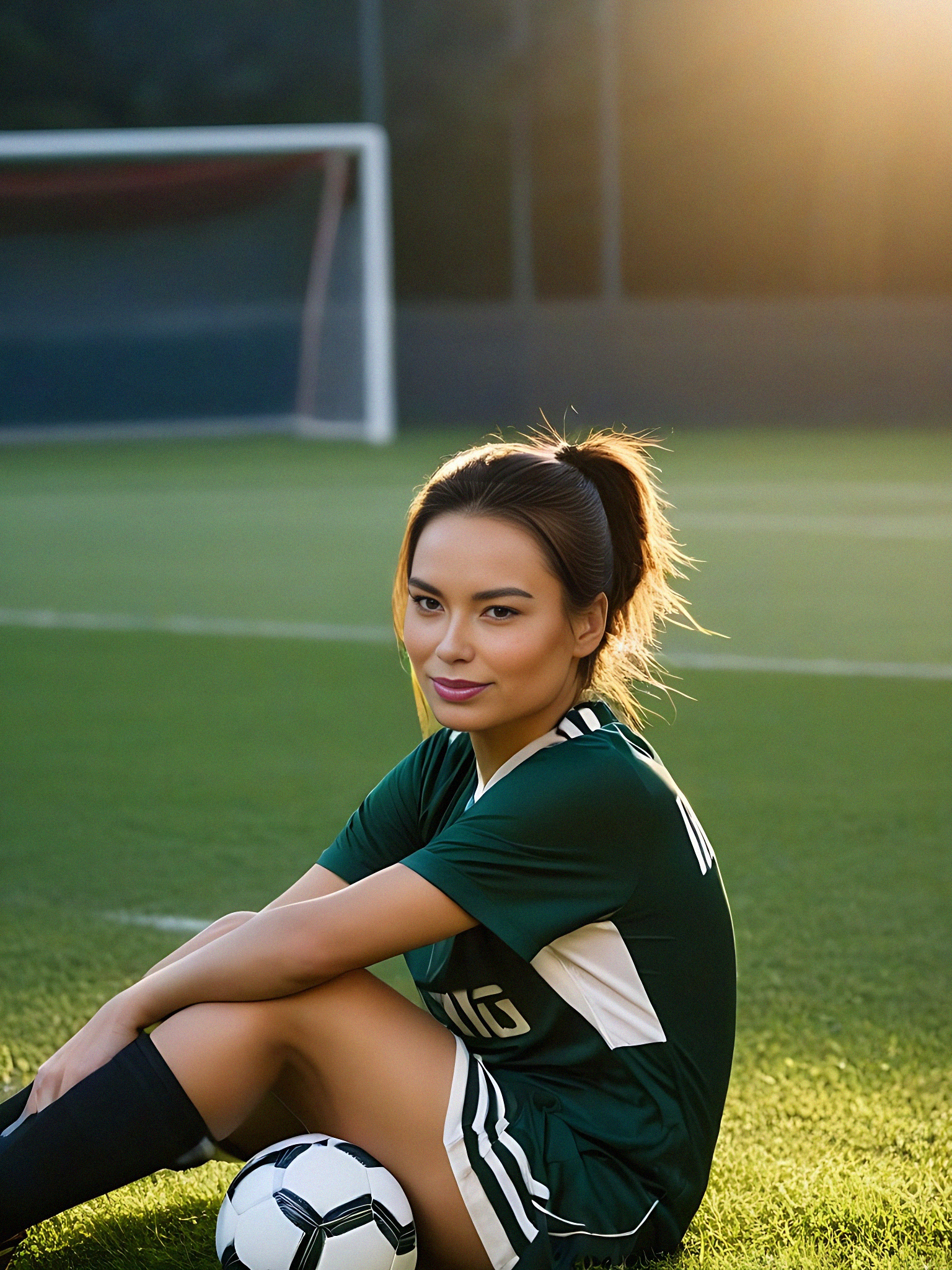 Wearing soccer uniform and soccer boots, sitting on grass, soccer ball