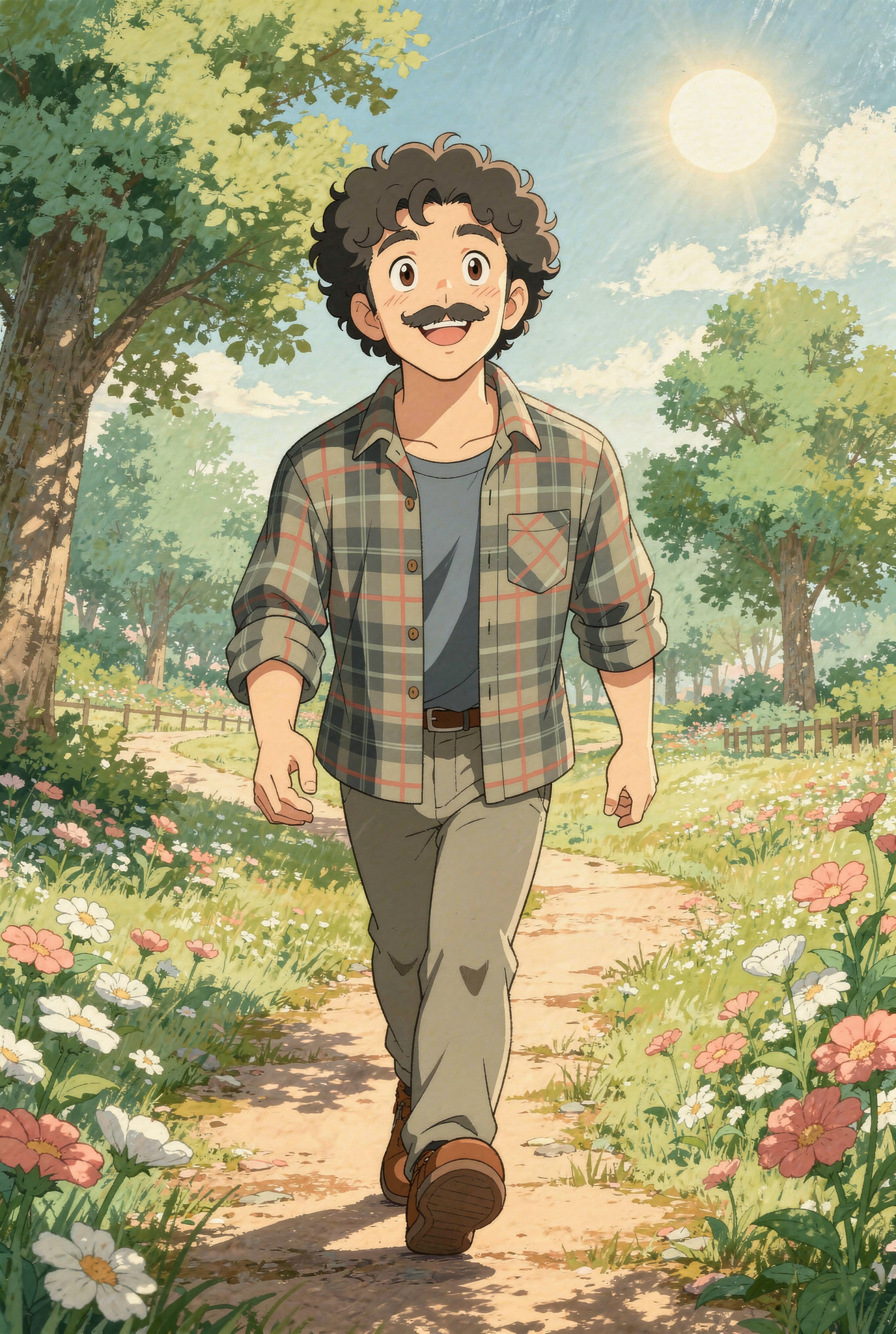 Studio Ghibli style illustration of this man, walking in a park in summer, graphic illustration, pastel colours, vibrant, highly detailed