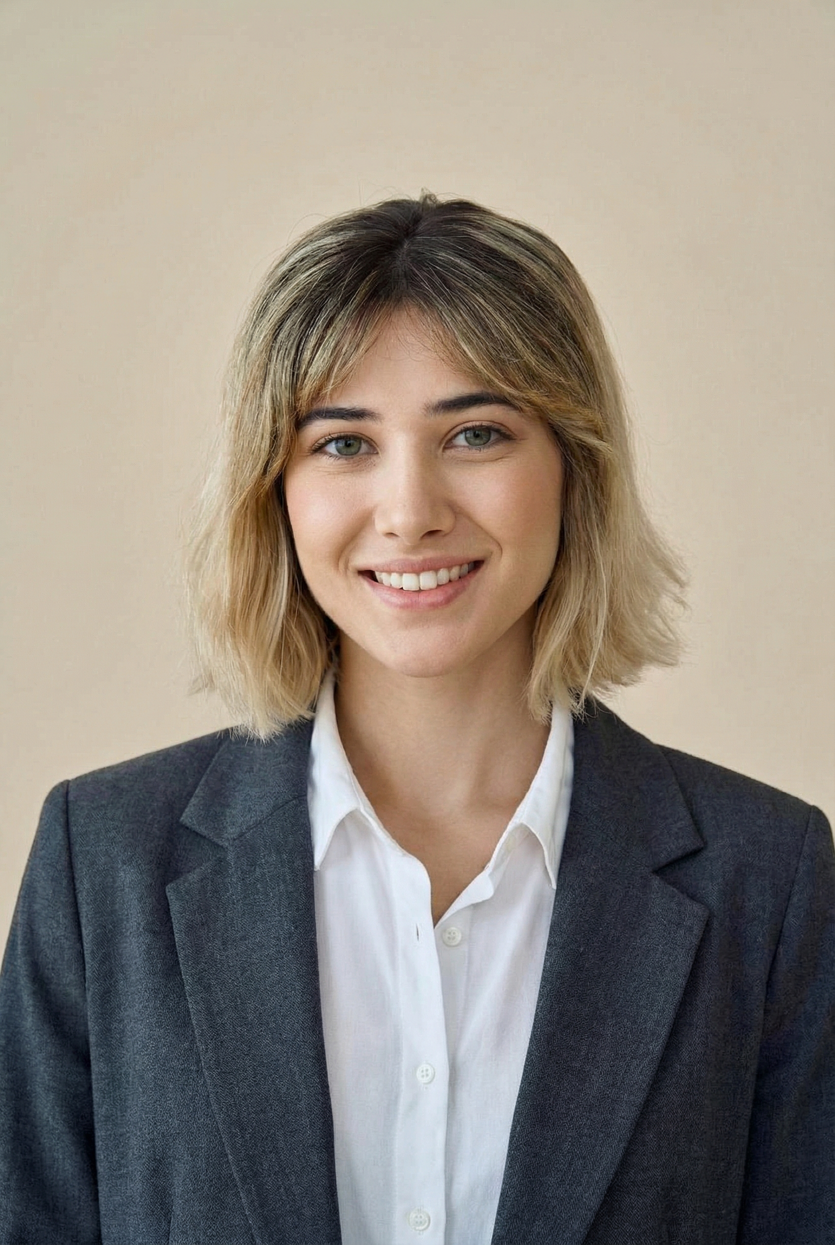 Job application headshot of this woman, plain background, well-groomed appearance, professional yet approachable