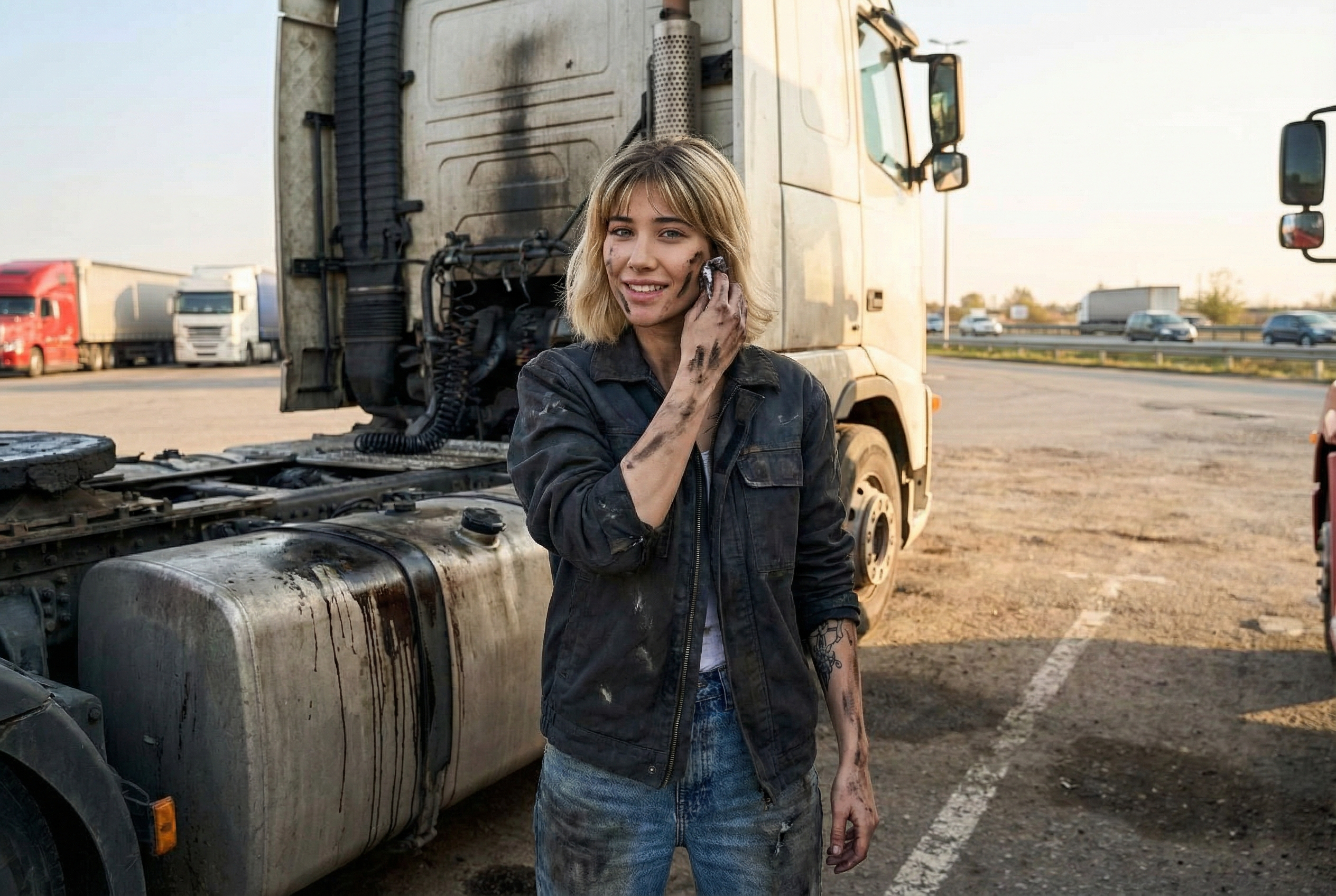 This young woman is a big truck driver, clothes covered in oil and dirt, she is standing near very big truck