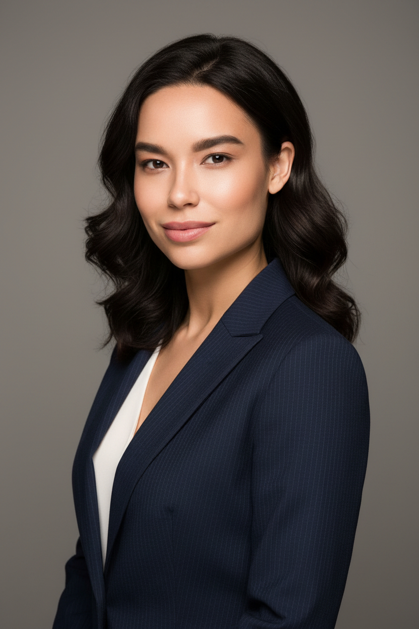 Professional headshot for this woman, confident business executive, navy suit, neutral gray background, soft studio lighting, sharp focus, corporate portrait