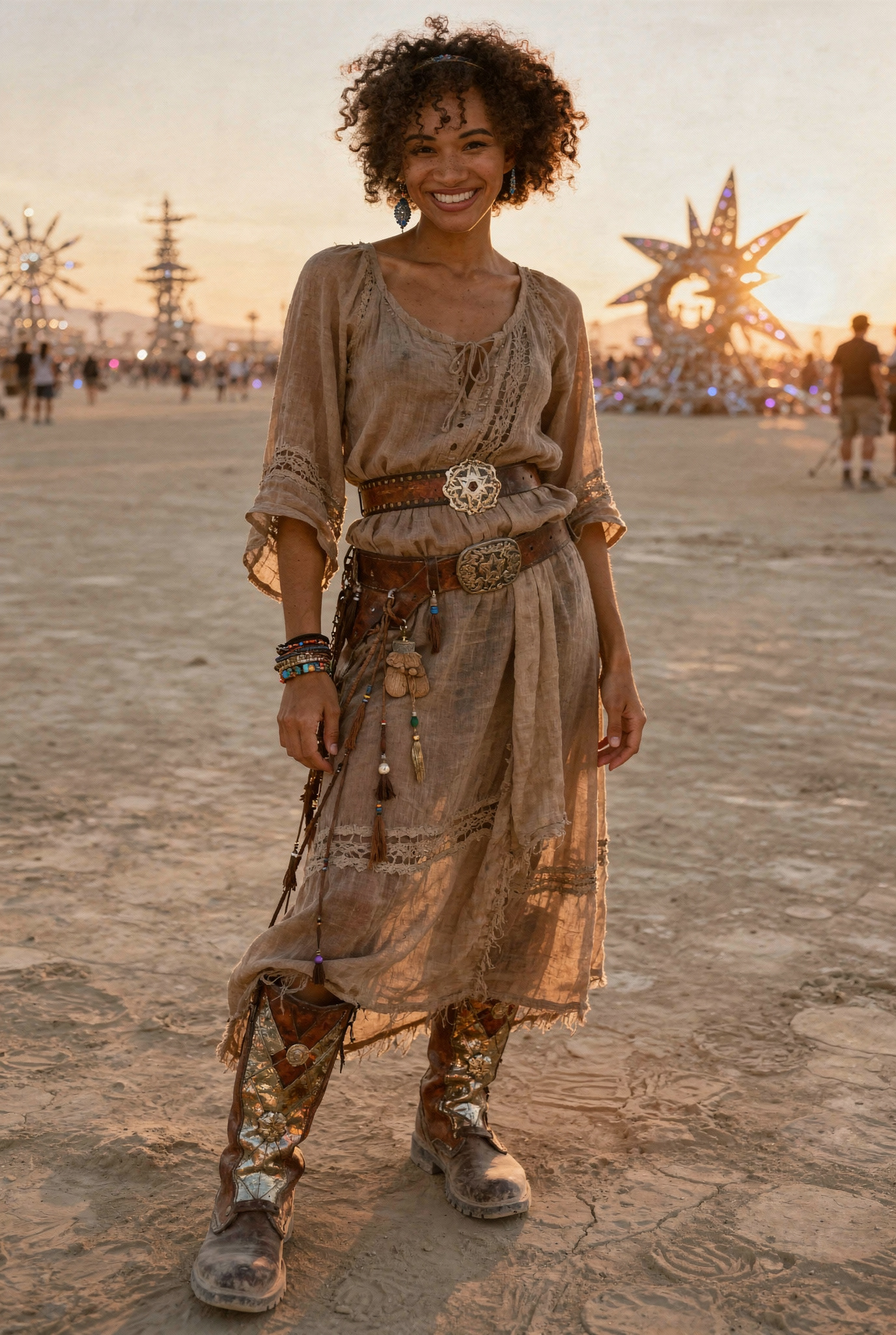 This young woman at Burning Man festival, wearing burning man outfit, late evening, full body shot, vintage boots, thin body