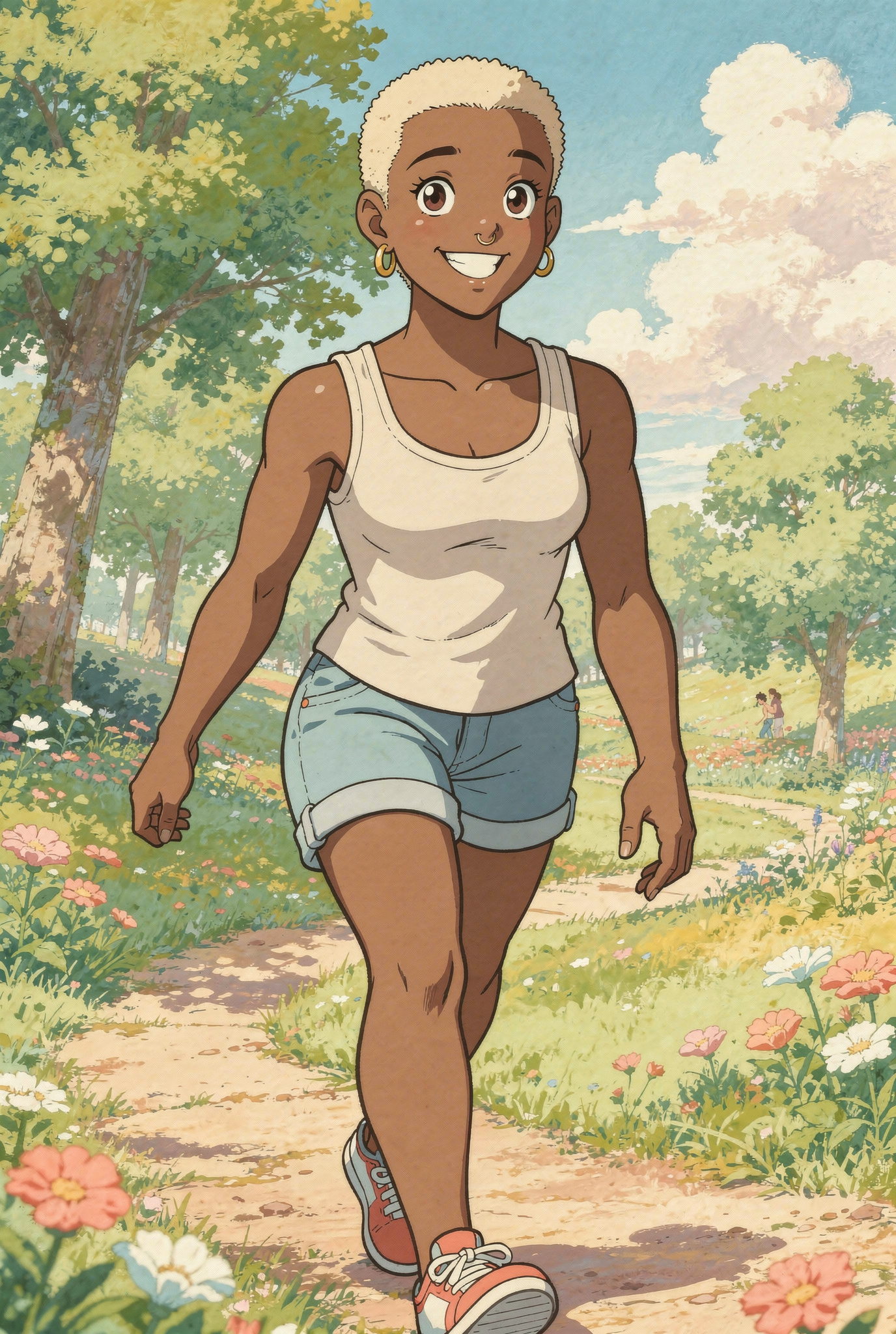 Studio Ghibli style illustration of this woman, walking in a park in summer, graphic illustration, pastel colours, vibrant, highly detailed