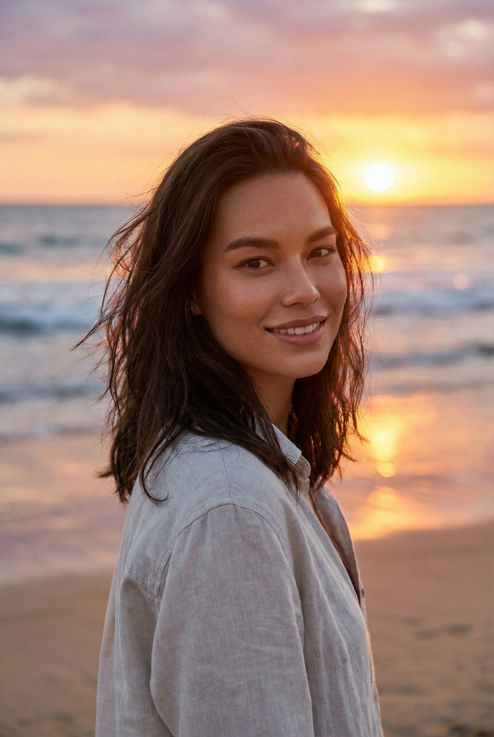 Golden hour portrait of this woman at sunset beach, relaxed confident smile, slightly tousled hair, warm romantic lighting