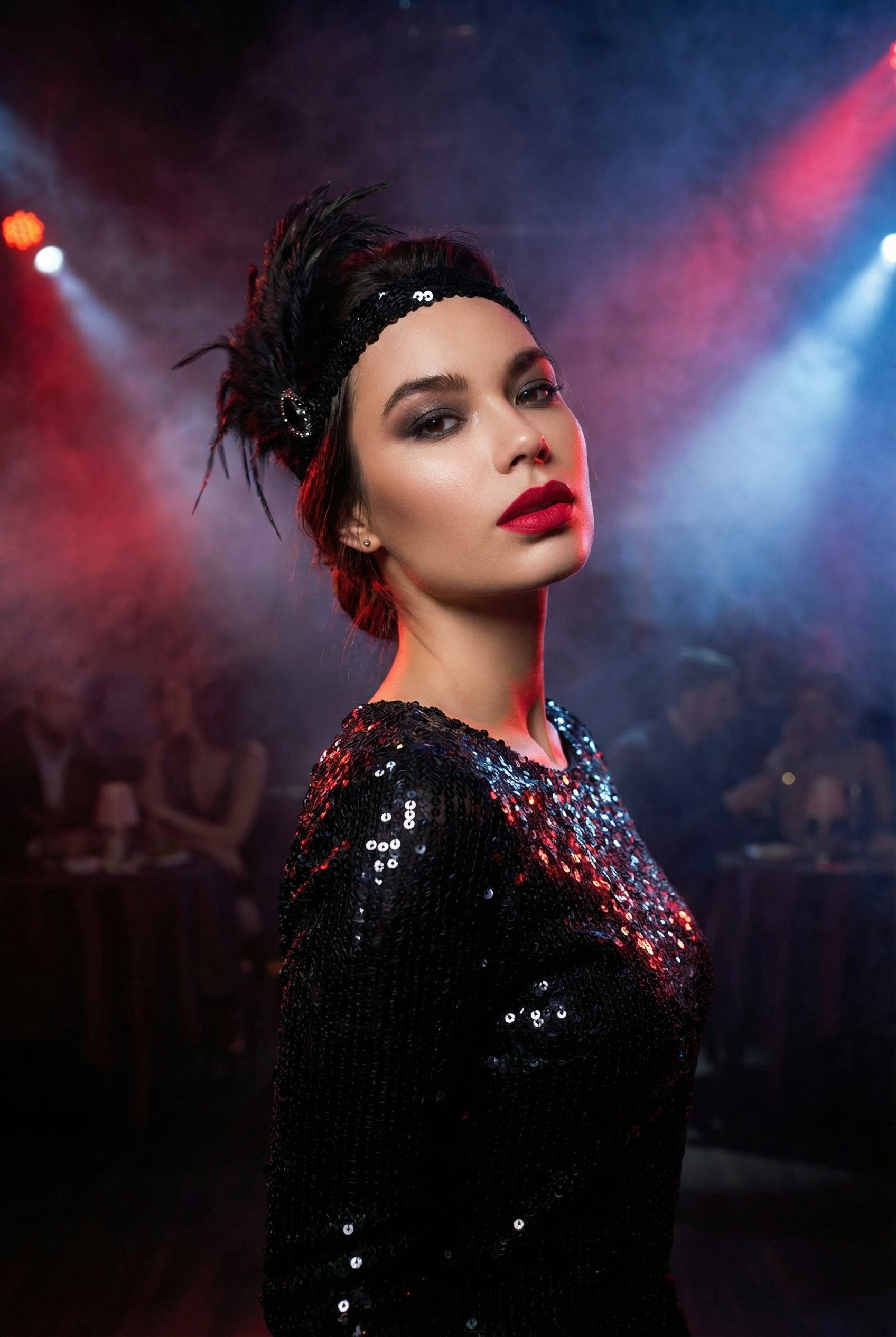 This Asian woman is wearing Cabaret style clothes, dark night club full of smoke