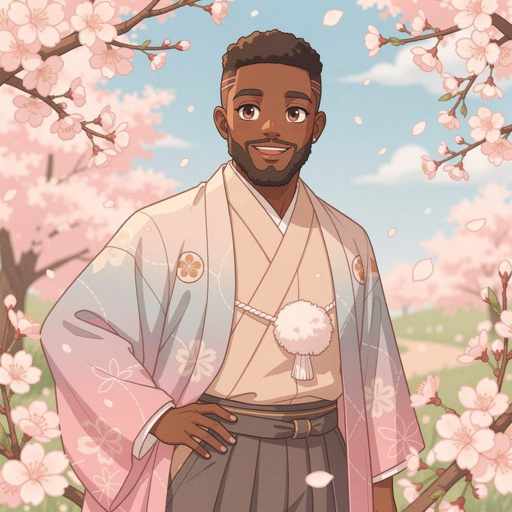 anime illustration Black man from these input image(s), wearing Japanese traditional clothing, sakura blooming, illustration, kawaii anime, masterpiece, beautiful, drawing