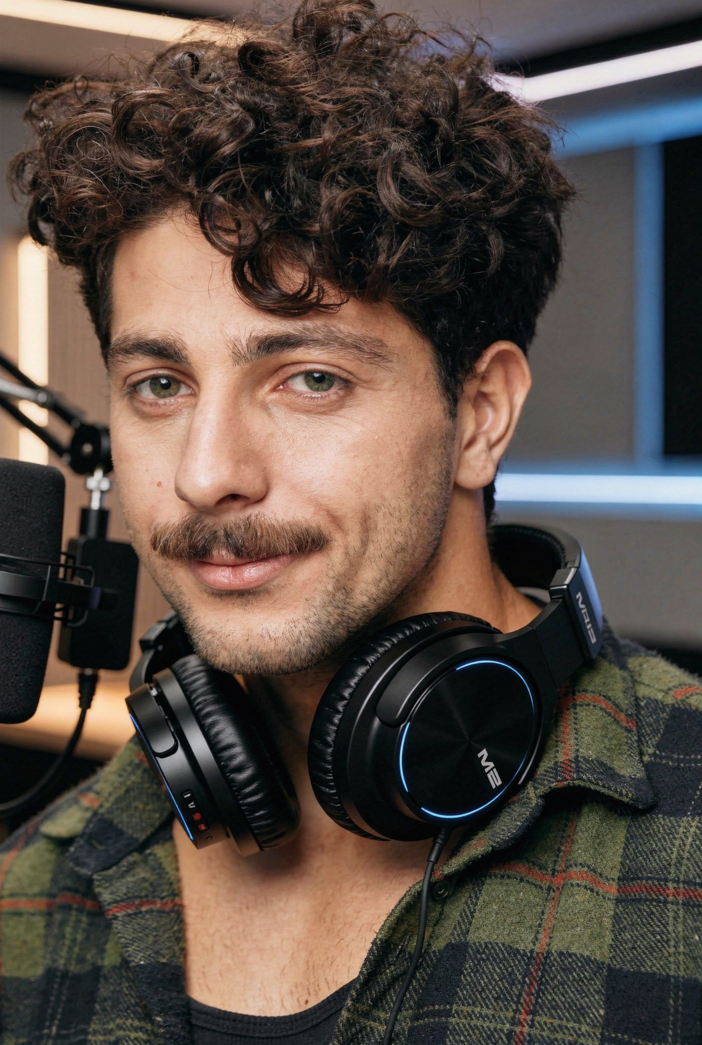 This man is a podcast host in modern studio setup, professional lighting, wearing headphones around neck, warm inviting expression
