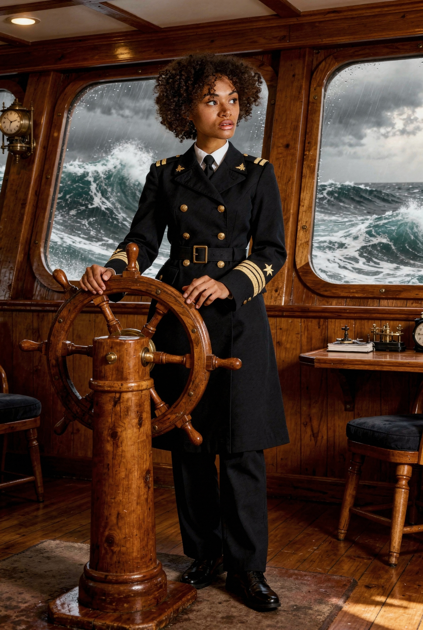 This woman is a captain of a big ship, holding the helm, captain's cabin, full body shot, storm weather