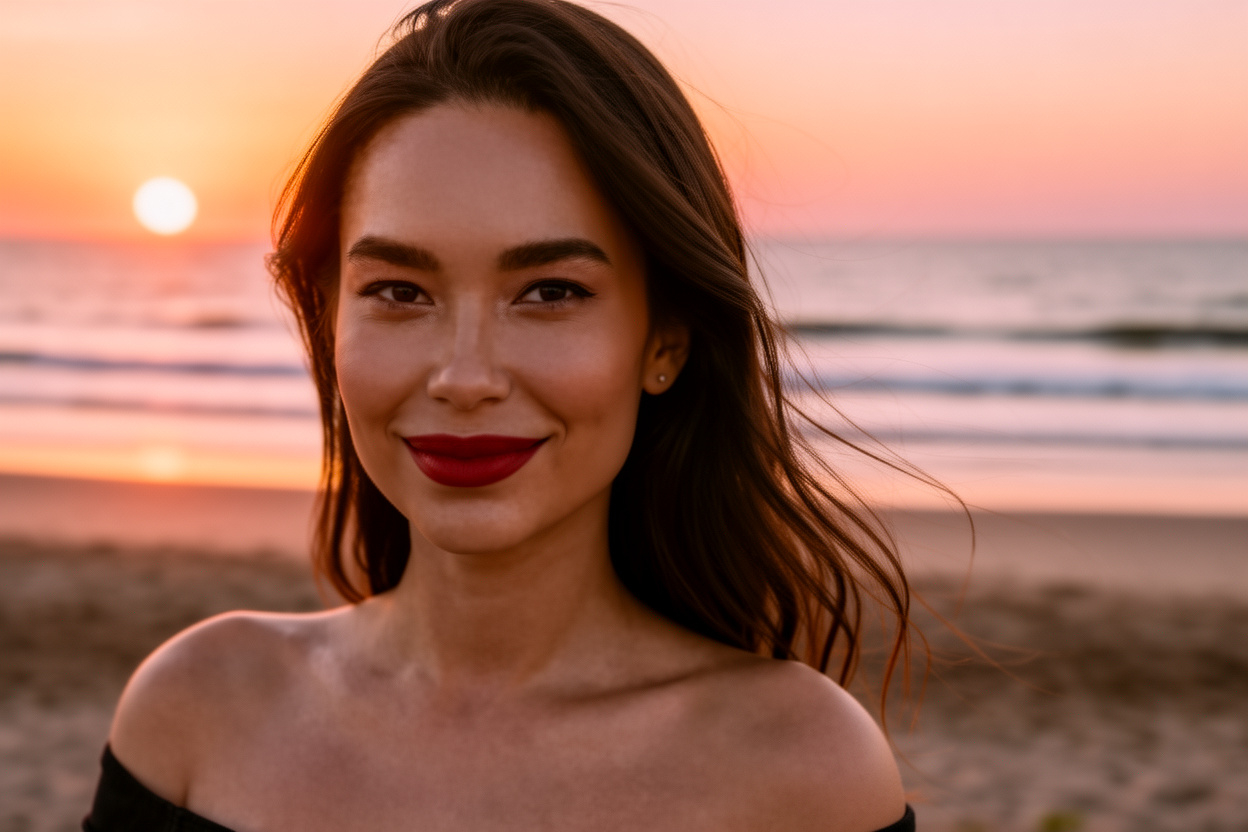 Golden hour portrait of this woman at sunset beach, relaxed confident smile, slightly tousled hair, warm romantic lighting