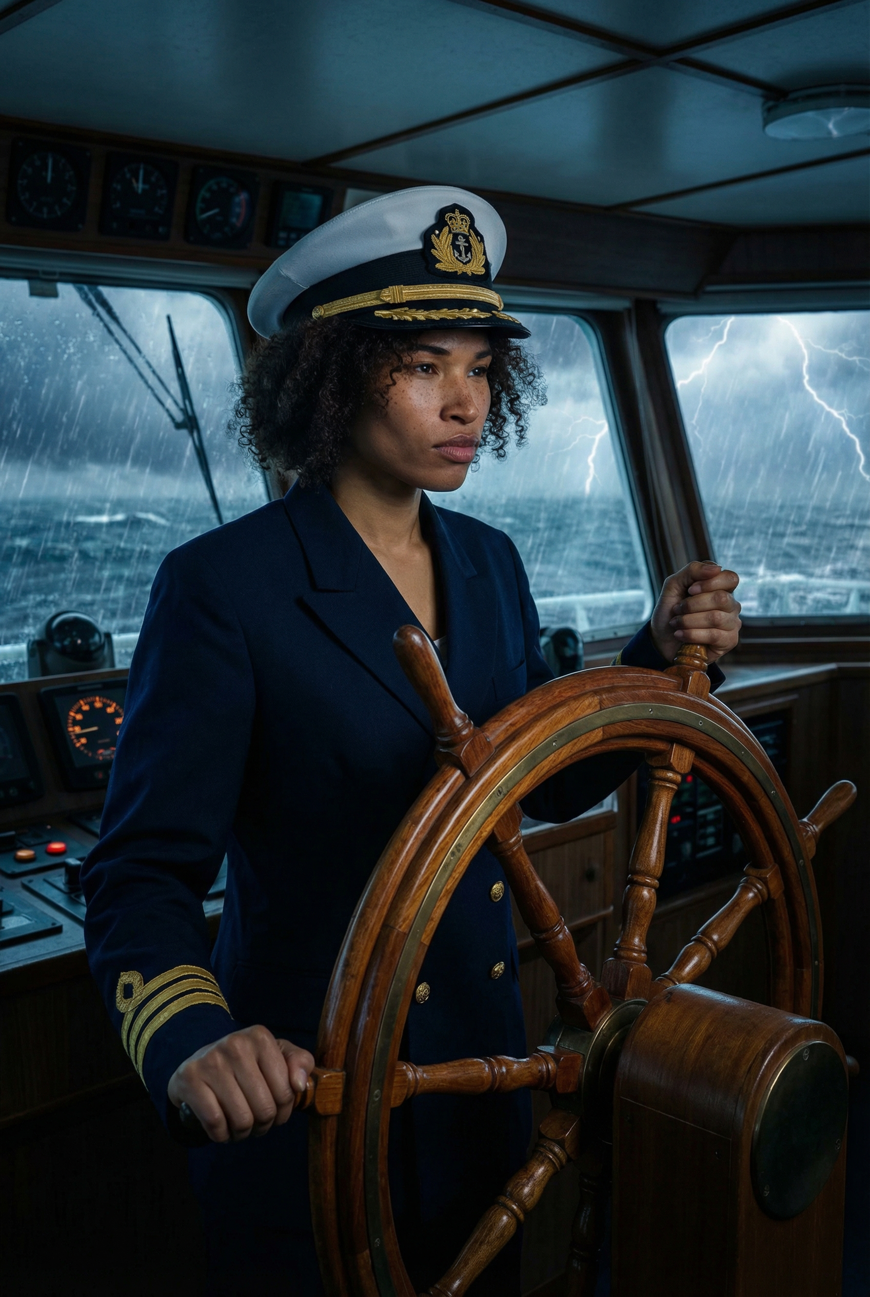 This woman is a captain of a big ship, holding the helm, captain's cabin, full body shot, storm weather