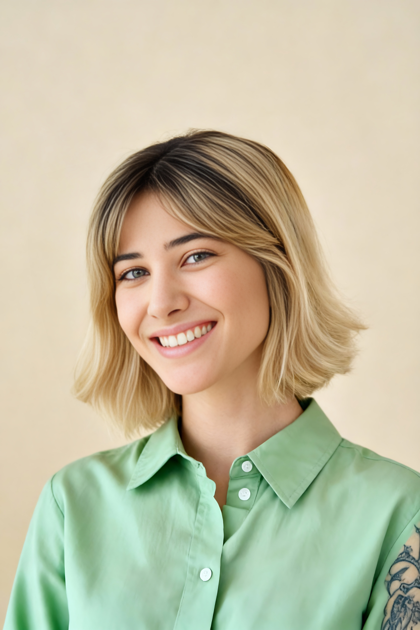 Job application headshot of this woman, plain background, well-groomed appearance, professional yet approachable