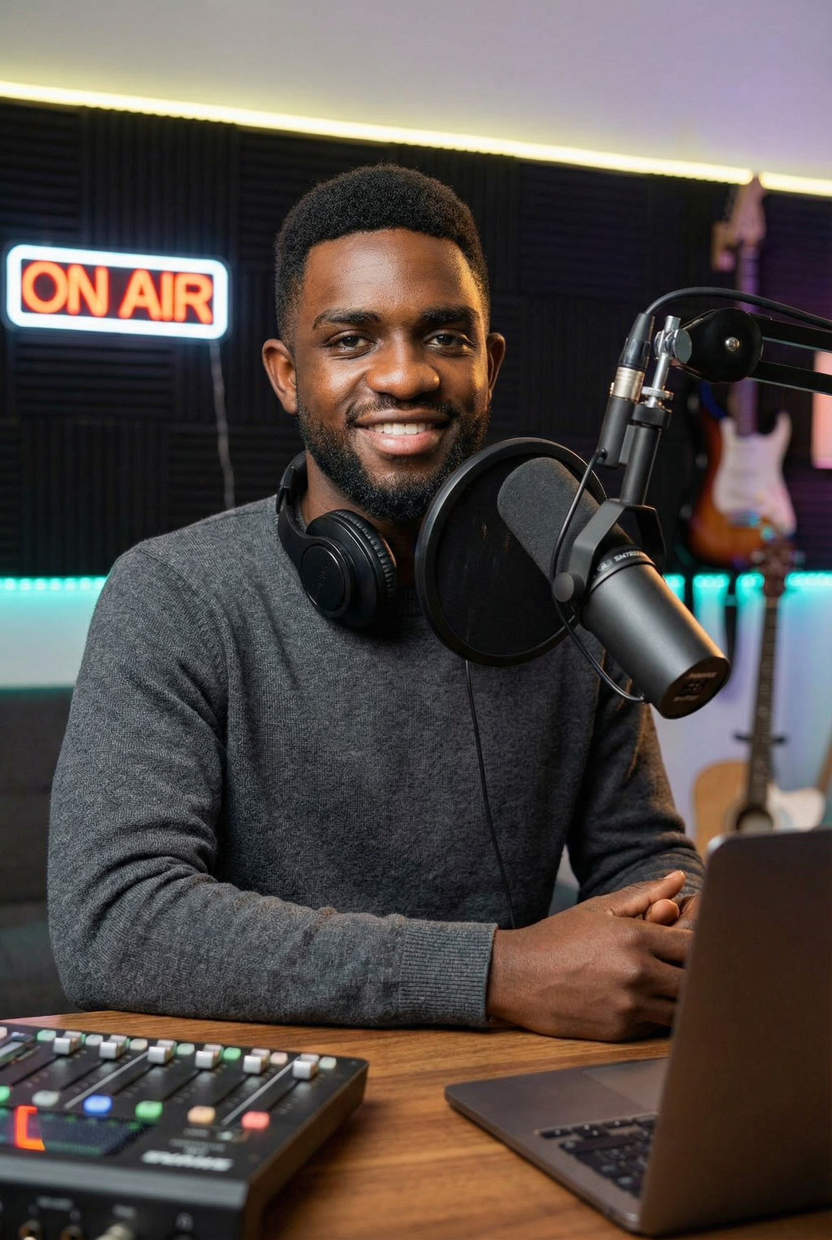This man is a podcast host in modern studio setup, professional lighting, wearing headphones around neck, warm inviting expression