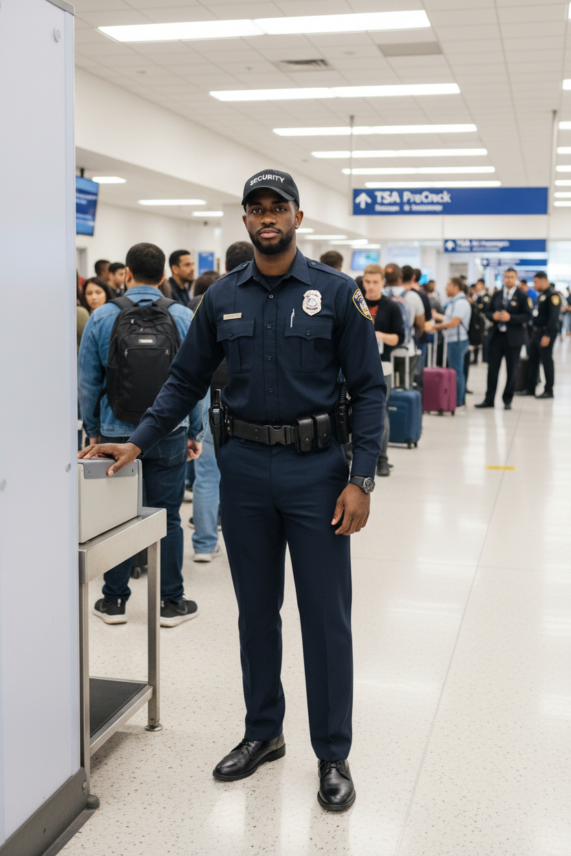 This man is a security guard in the airport, serious face, rush hour, full body shot