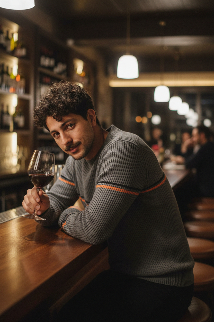This man in a wine bar setting, moody ambient lighting, relaxed pose leaning on bar, confident alluring expression