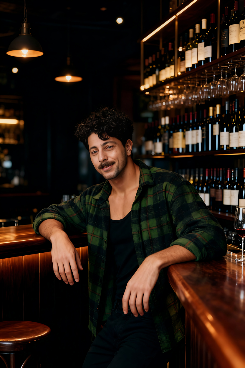This man in a wine bar setting, moody ambient lighting, relaxed pose leaning on bar, confident alluring expression