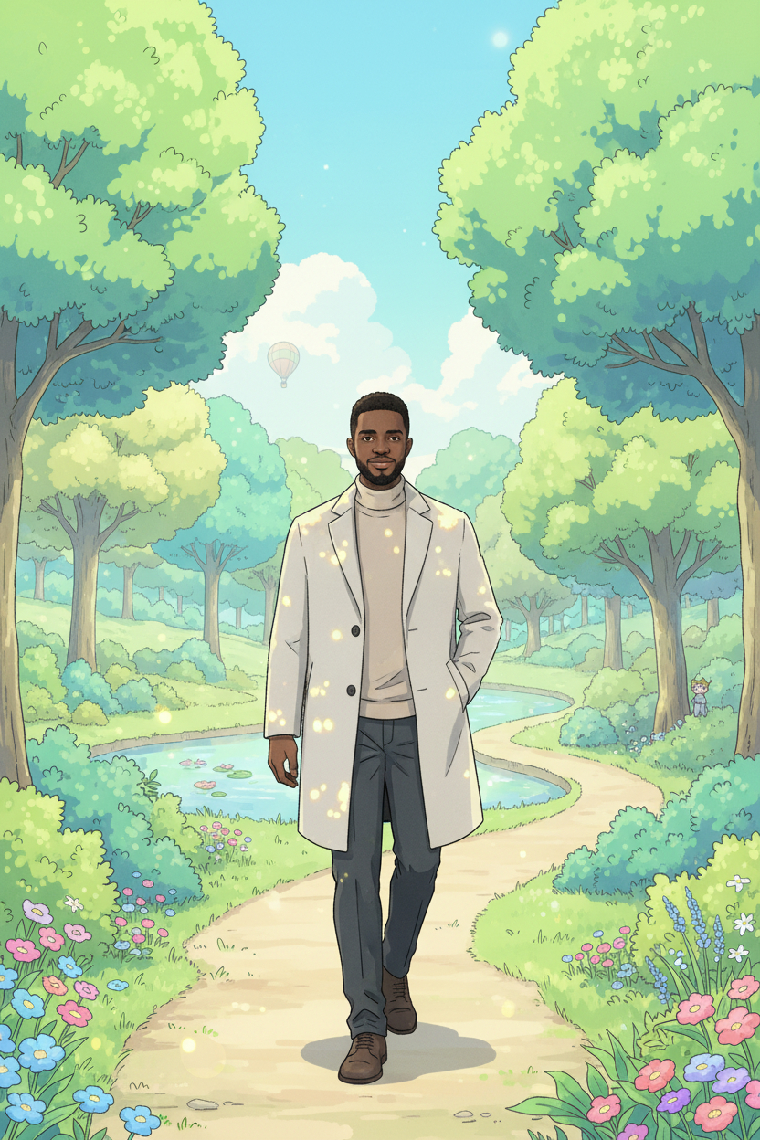 Studio Ghibli style illustration of this man, walking in a park in summer, graphic illustration, pastel colours, vibrant, highly detailed