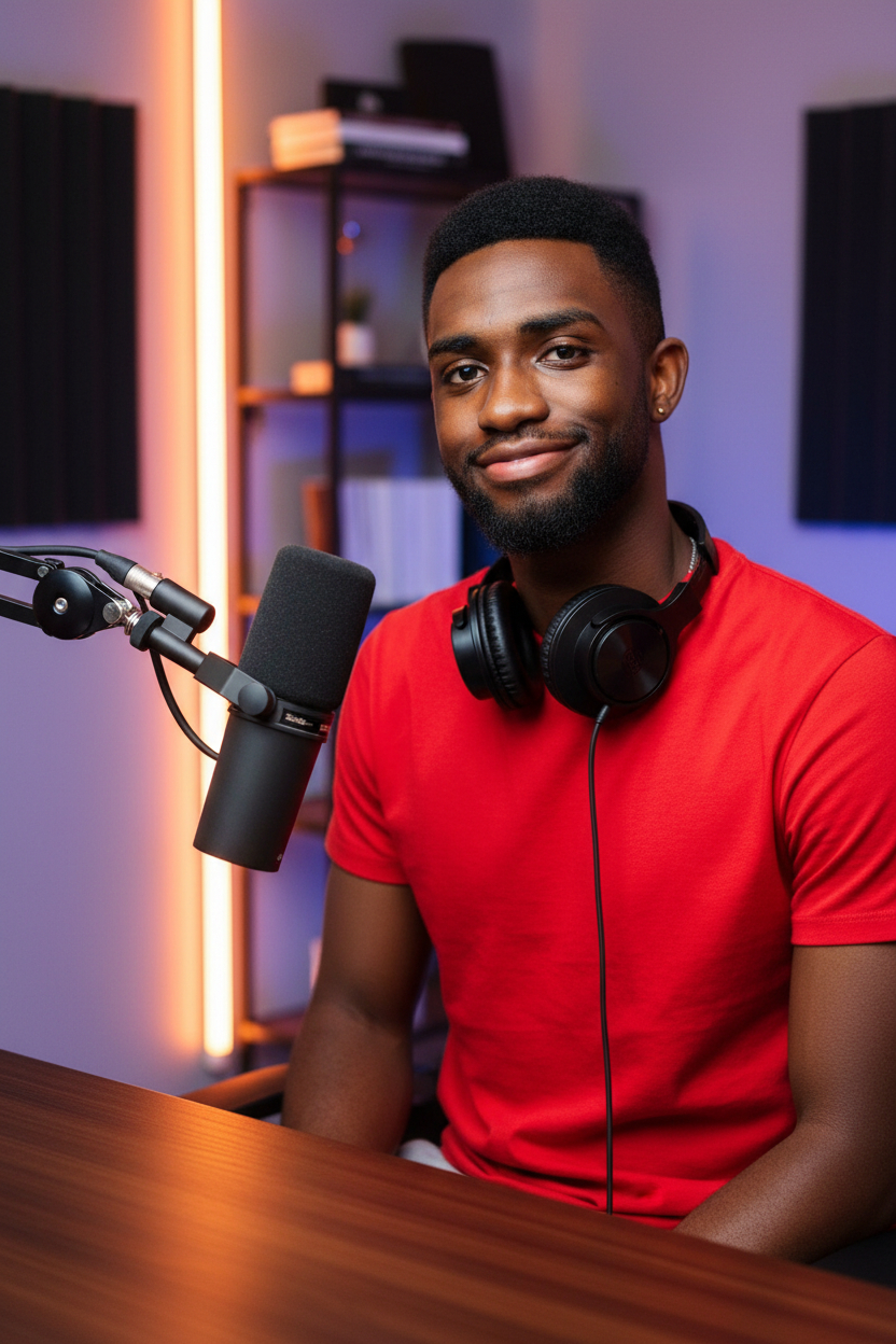 This man is a podcast host in modern studio setup, professional lighting, wearing headphones around neck, warm inviting expression