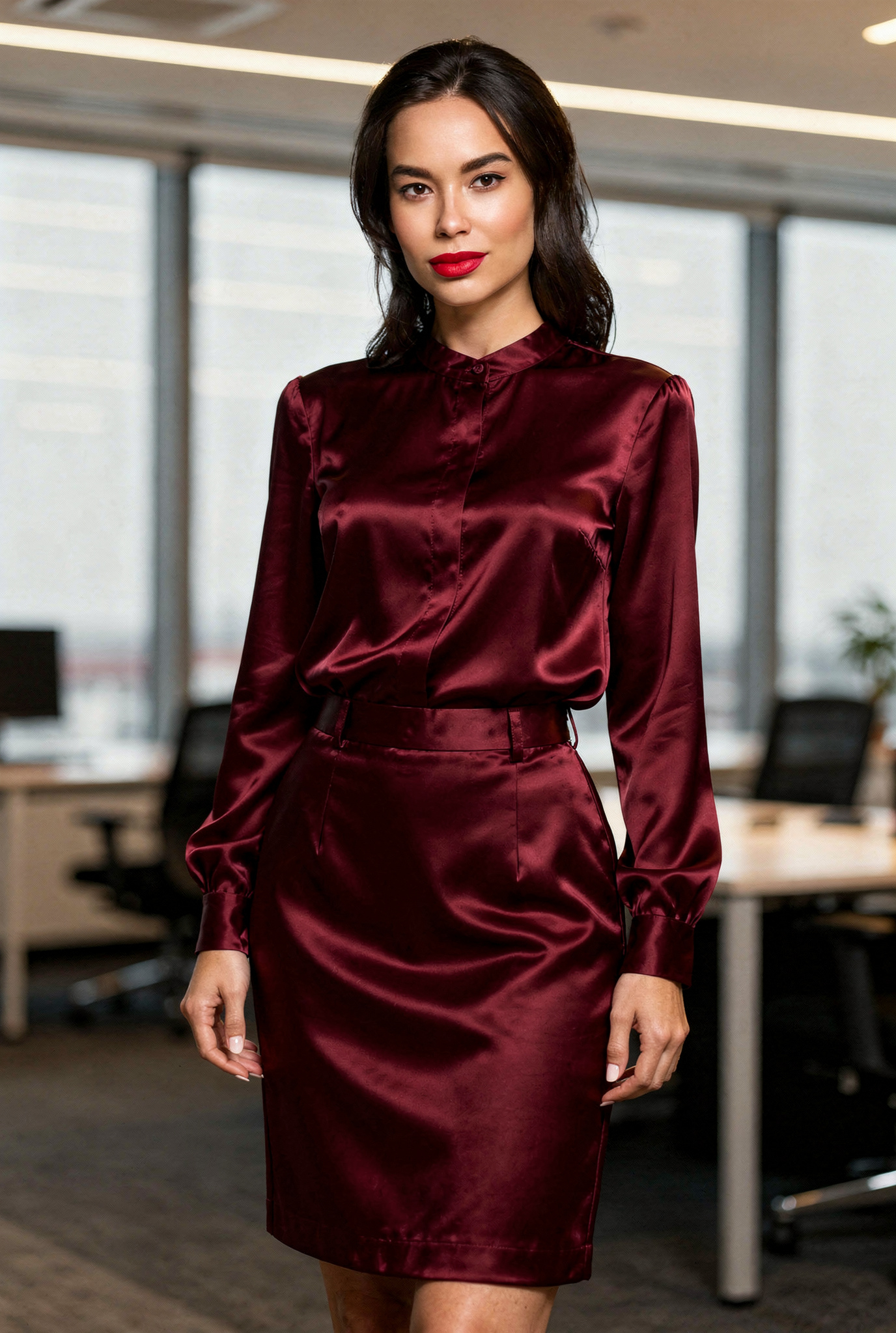 root wide shot of analog style modelshoot style, wearing dark red silk crop top and dark red silk skirt working in the office. posing for photo, crisp details, neutral expression, high-definition, sharp focus, ambient lighting, masterpiece, cinematic light, ultrarealistic, photorealistic, 8k, raw photo, realistic, sharp focus on eyes, symmetrical eyes, intact eyes, hyperrealistic, highly detailed, masterpiece, best quality, extremely detailed 8k wallpaper, masterpiece, best quality, ultra-detailed, best shadow, detailed background, detailed face, detailed eyes, high contrast, best illumination, detailed face, dulux, caustic, dynamic angle, detailed glow. dramatic lighting. highly detailed, insanely detailed hair, symmetrical, intricate details, professionally retouched, 8k high definition. strong bokeh. award winning photo.