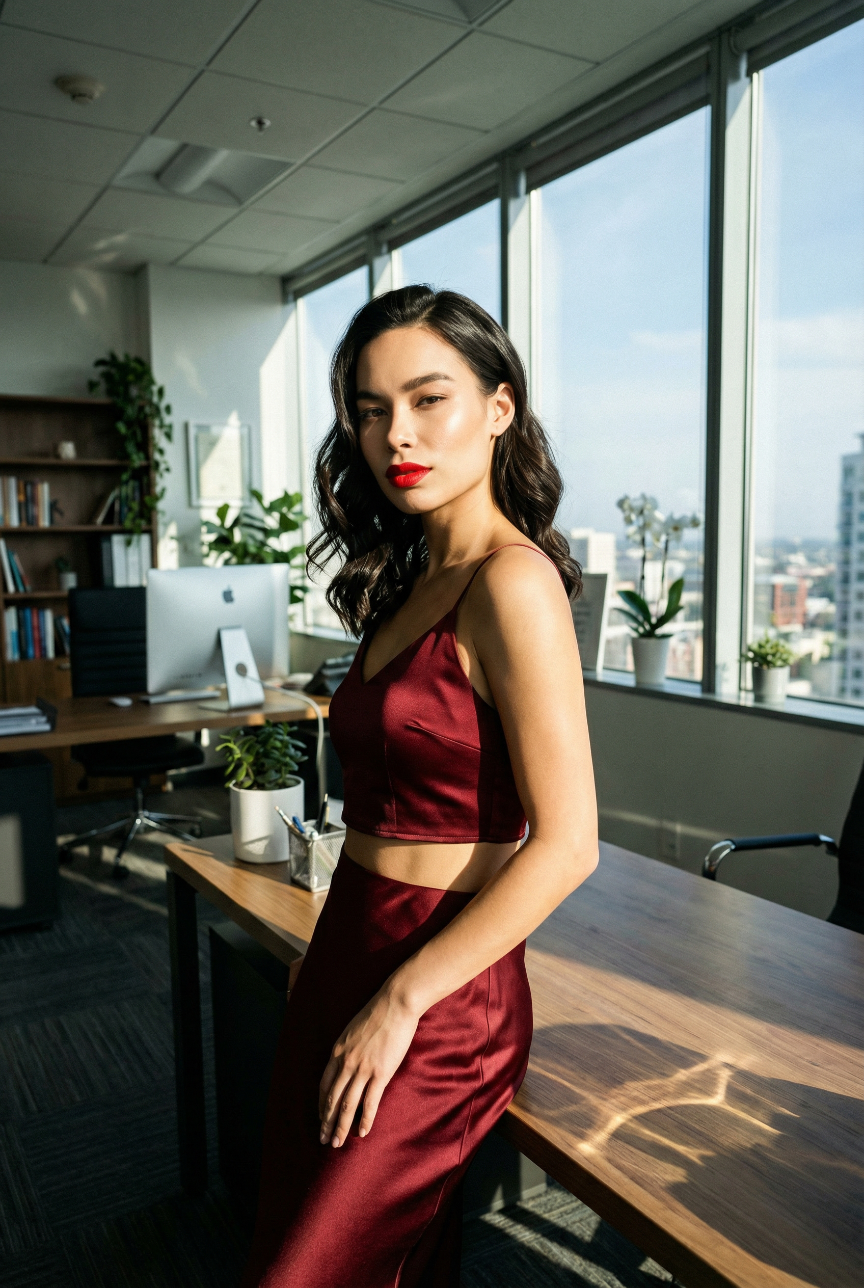 root wide shot of analog style modelshoot style, wearing dark red silk crop top and dark red silk skirt working in the office. posing for photo, crisp details, neutral expression, high-definition, sharp focus, ambient lighting, masterpiece, cinematic light, ultrarealistic, photorealistic, 8k, raw photo, realistic, sharp focus on eyes, symmetrical eyes, intact eyes, hyperrealistic, highly detailed, masterpiece, best quality, extremely detailed 8k wallpaper, masterpiece, best quality, ultra-detailed, best shadow, detailed background, detailed face, detailed eyes, high contrast, best illumination, detailed face, dulux, caustic, dynamic angle, detailed glow. dramatic lighting. highly detailed, insanely detailed hair, symmetrical, intricate details, professionally retouched, 8k high definition. strong bokeh. award winning photo.